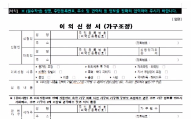 다양한 이의신청이 가능한 경우가 있지만 이의신청 서류를 보면서 가능한 경우를 살펴보자면 가구 구성 관련 이의신청은 혼인과 이혼 있습니다. 혼인 하였는데 반영 안 되었거나, 이혼 상태임에도 반영이 안되어 있다면 꼭 신청을 하셔야 겠죠. 또한 출생과 사망에 반영이 안되어 있다면 이것 또한 이의 신청을 하셔야 합니다. 특히나 출생의 경우에는 반영이 안되어 있었다는 블로그 글과 카페 글들이 꽤 있었기 때문에 이런 부분도 참고하셔서 신청하시길 바랍니다.