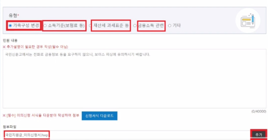 가족 구성원 변경 소득기준, 재산세 과세표준 금융소득 등 다양한 이의신청 이유를 넣어주시고 추가 설명이 필요하시면 꼭 추가 설명을 넣어 주세요. 본인이 처한 각 사유마다 요구 되는 필요 서류를 준비하셔서 첨부 하시고 신청을 하시면 됩니다. 각 처리 기관인 거주지 행정기관에서 처리를 하게 되기 때문에, 거주지 기관 선택하시고 신청 완료 하신 뒤 기다리시면 됩니다. 꼭 본인이 이의 제기를 하는 분야의 서류를 꼼꼼히 준비하셔서 신청하셔서 받으실 수 있기를 바라겠습니다.