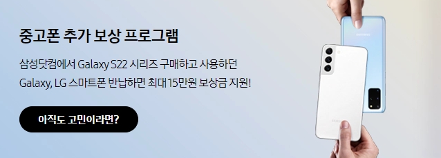 첫 번째. 중고폰 추가 보상 : 그동안 사용한 갤럭시 및 LG 스마트폰을 반납한 뒤 갤럭시S22 삼성닷컴을 통해 구입 할 경우 최대 15만원까지 보상금을 지원 합니다.