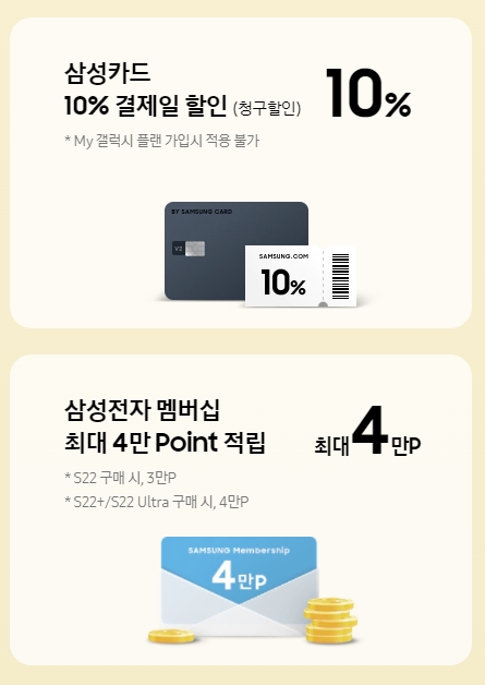 갤럭시S22 삼성닷컴 사전예약 사은품으로 해당 홈페이지에서 단독컬러 모델 구입하면 "네이버페이 최대 2만 포인트 증정" 하며 울트라 모델은 2만 포인트, 플러스 모델은 1만 포인트로 두 모델 모두 3,500대 선착순 한정입니다. 그리고 삼성닷컴 사전예약 시에는 삼성카드 결제일에 10% 할인(My 갤럭시 플랜 가입 시 적용되지 않으니 참고하세요), "삼성전자 멤버십 최대 4만 포인트 적립" 해주는 혜택이 있습니다.