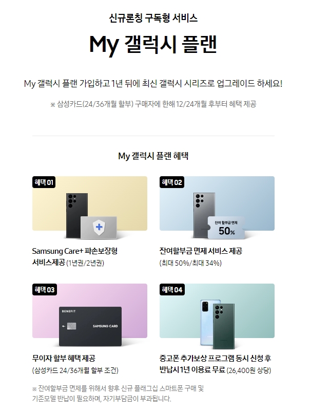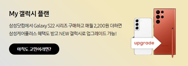 두 번째. My 갤럭시 플랜 서비스 : 갤럭시S22 구매 뒤 매월 2,200원 자동결제시 삼성케어플러스 혜택에 추가적으로 새로운 갤럭시 업그레이드가 가능 합니다.